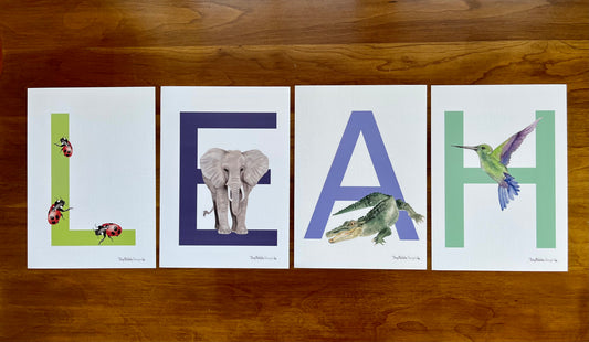 Tiny Pebble Designs alphabets are adorned with hand drawn elements from the natural world. Available as posters, individual alphabet art and any combination of custom words and names. Choose from my botanical or animal series. I use high quality matte paper for all of my letter prints.
